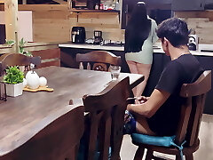 چاق, لاتین, مادر با سینه های بزرگ دعوت فرزند خوانده او را به سعی کنید بیدمشک آبدار او