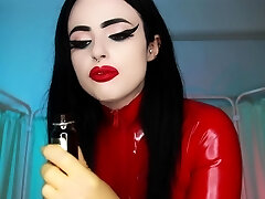 Skin Diamond stretches pussy with fingers in red latex gloves